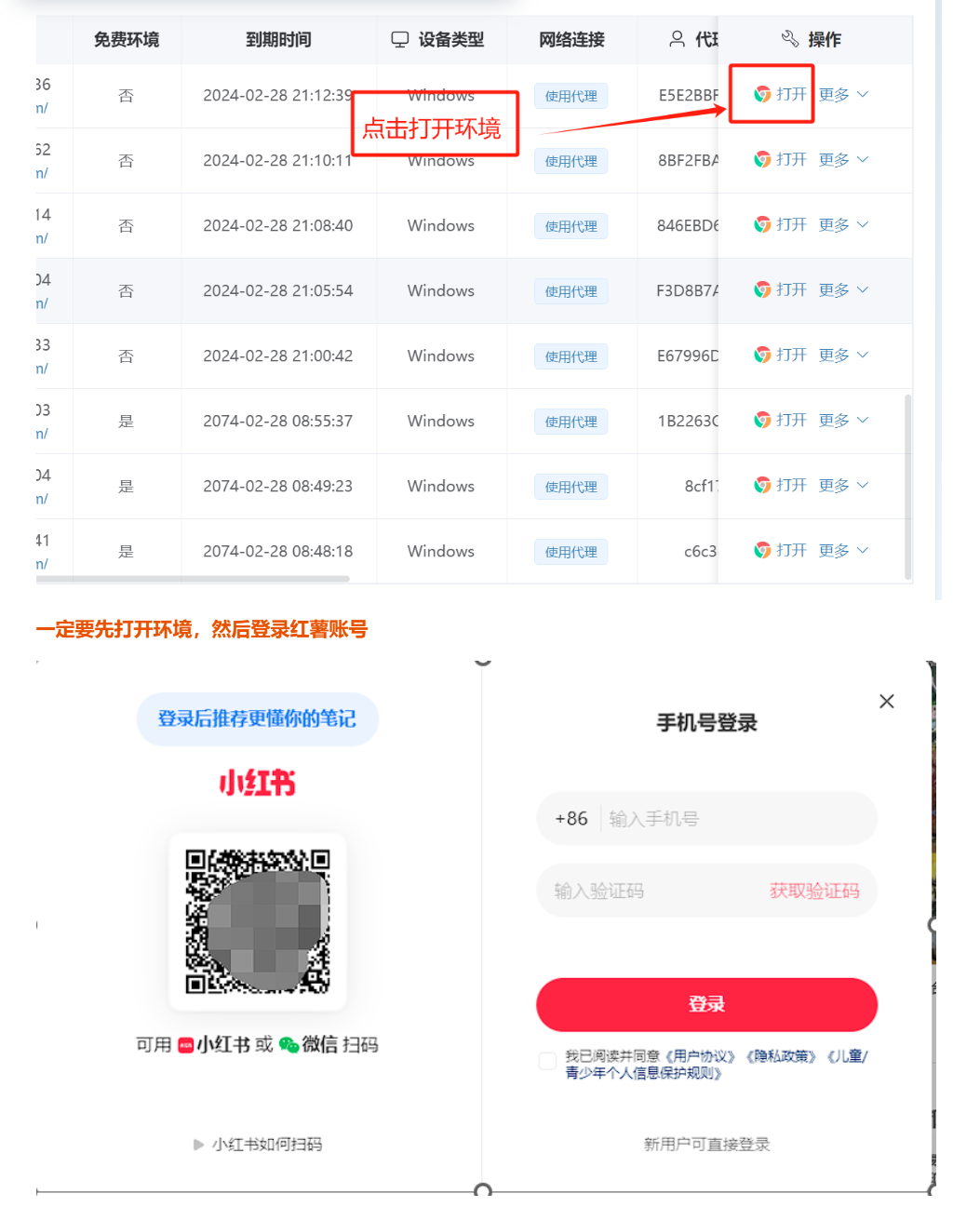 新增环境之后,点击打开刚才新增好的环境,登录红薯账号使用自备手机号或者接码平台登录红薯账号,再次打开环境就可以看见红薯账号已经登陆。红薯账号短信登录可能失败,可以尝试手机扫码登录即可。