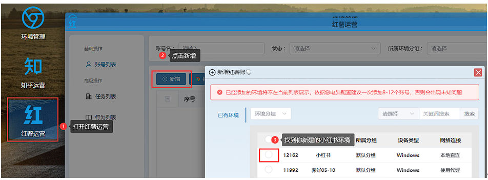 打开【红薯运营】,点击【新增】,选择刚才已经登陆的红薯的账号环境