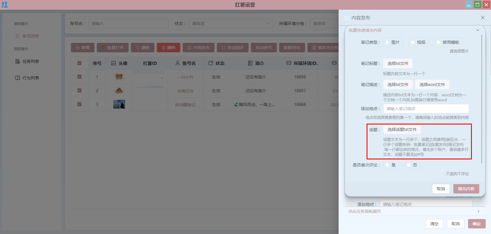 话题文本为一行多个,话题之间请用||做区分,一行多个话题举例:批量笔记||批量发布||笔记发布 每一行都这样的格式2、填充