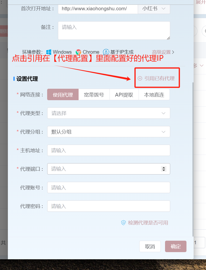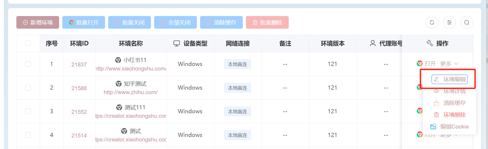 点击【更多】-【编辑环境】, 前提条件是在【代理配置】页面进行了代理的添加,请参考关于代理IP配置的教程