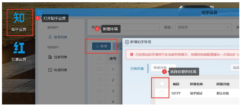 一定要先从【环境管理】注册或登录账号后再从【知乎运营】里面“添加”账号注册的时候选取的手机号归属地一定要和IP的归属地一致, 两者的归属地越近越不容易封号,否则刚登陆进去就会异常提示