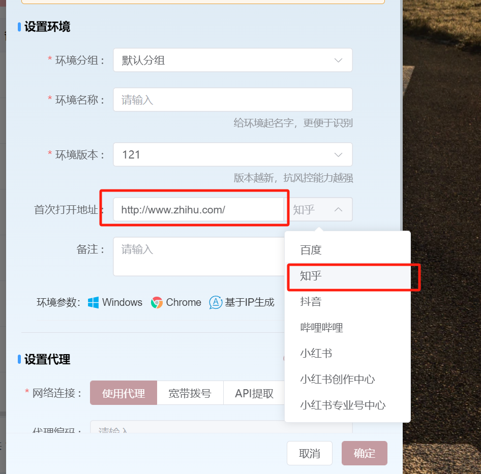 不知道这一步的小伙伴请先阅读【代理配置】和【环境管理】的教程创建环境的时候记得把首次打开地址设置为 知乎的主页链接